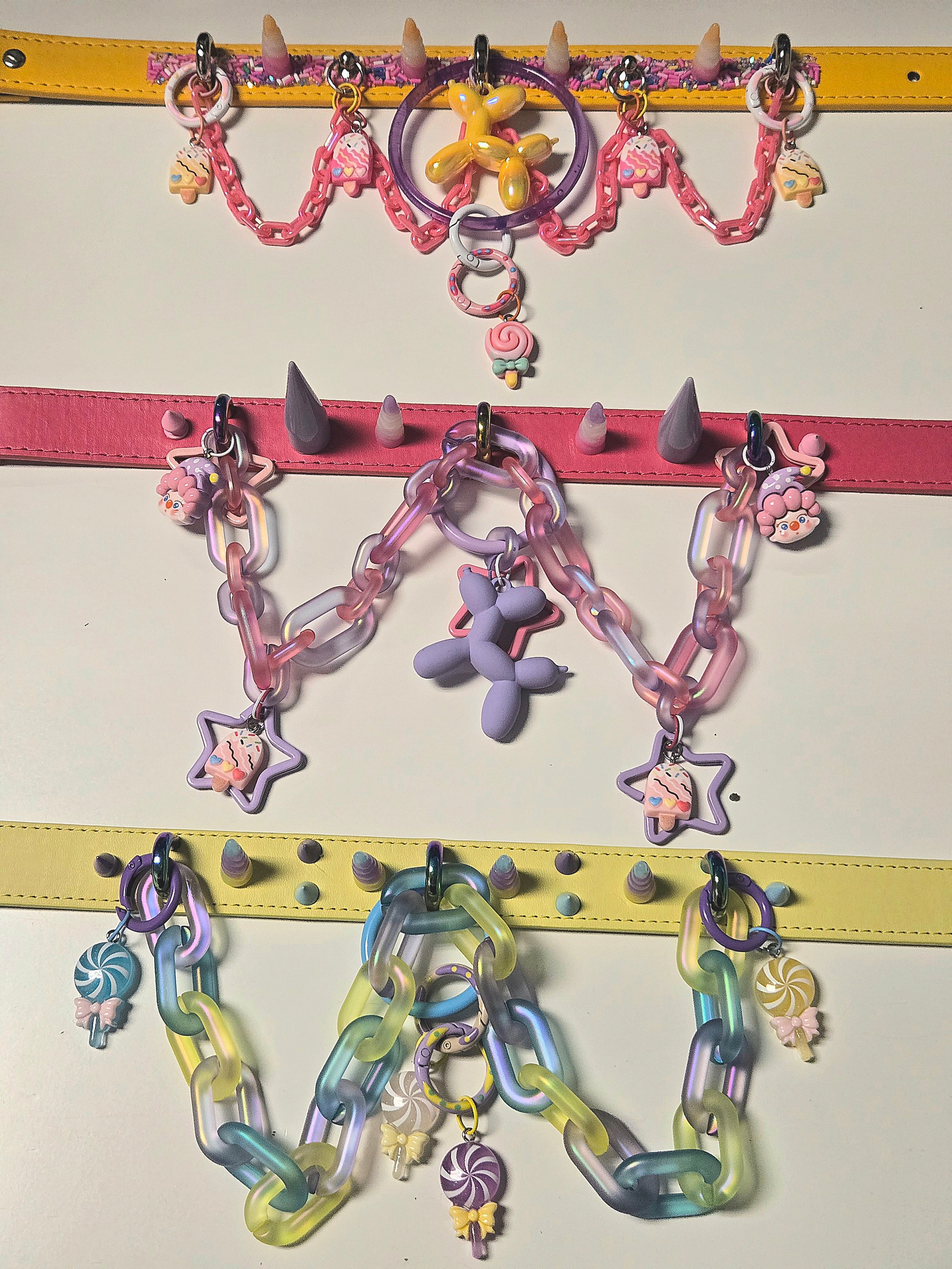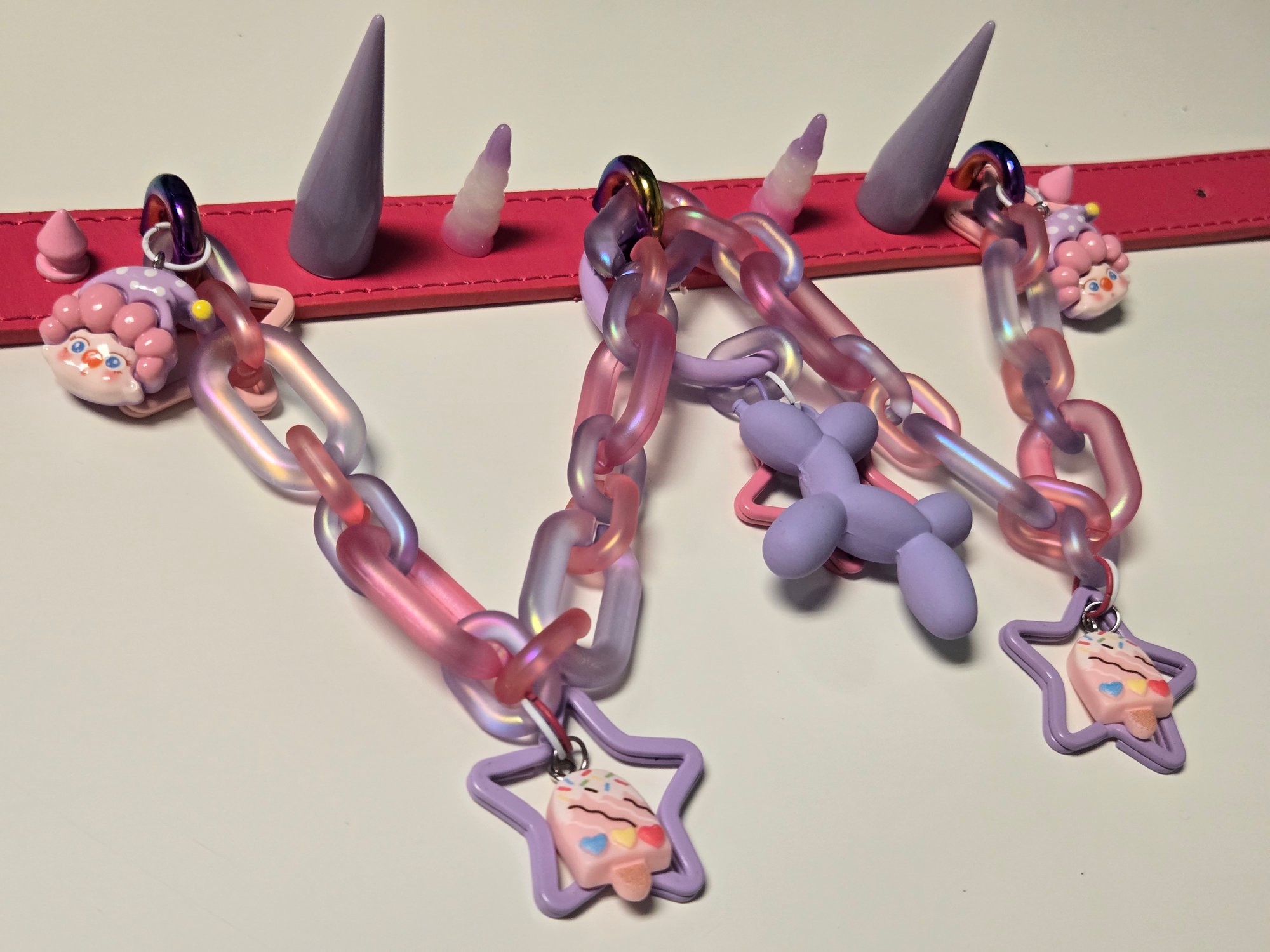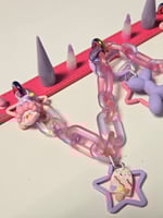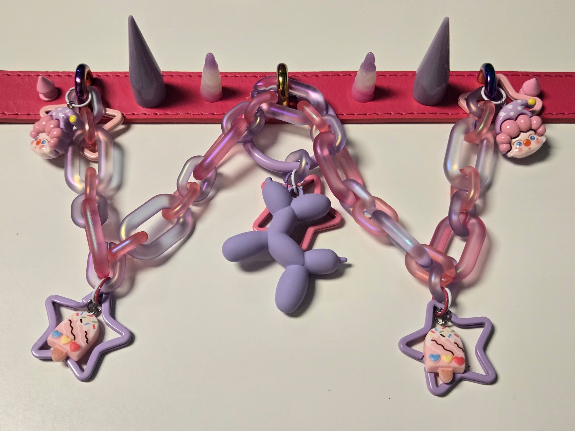It features a CHUNKY chain, detachable oring with balloon dog/star and clowns/sweets accent charms!